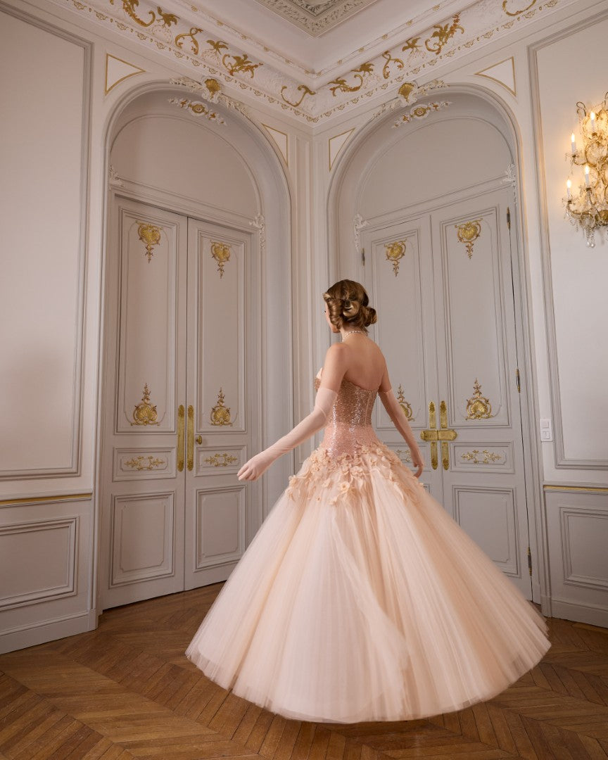 A stunning peach-colored gown is being showcased, with ombré embellishments and delicate 3D flowers cascading from the waist. It’s all presented in a luxurious setting, and it’s worn by ‘Grace’—named after Princess Grace of Monaco, who loved flowers. It’s perfect because she adores that floral touch