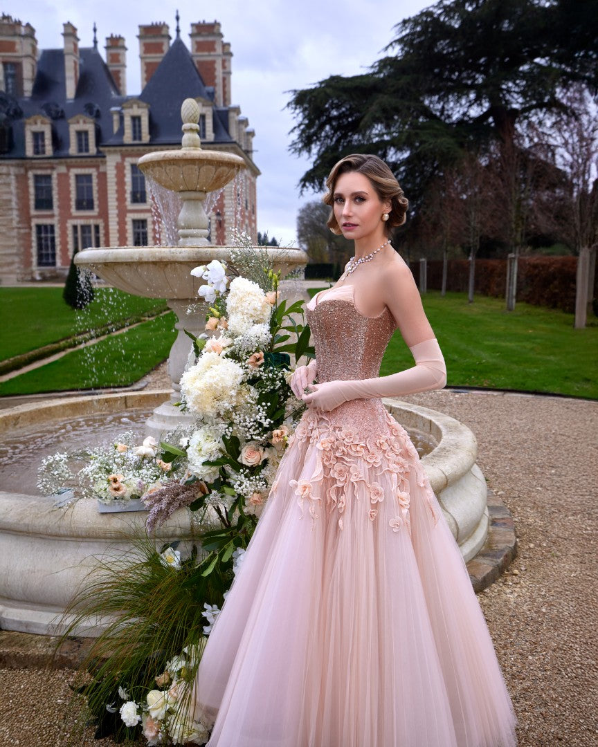 فستان بلون خوخي مبهر، مع تدرجات أومبري بنفس الدرجات وتفاصيل زهور ثلاثية الأبعاد تتدفق من الخصر. يُعرض في أجواء فاخرة، وترتديه ‘غريس’، التي سُمّيت تيمّناً بالأميرة غريس التي عُرفت بحبها للورود، مما يجعل هذا الاختيار مثالياً لشخصيتها