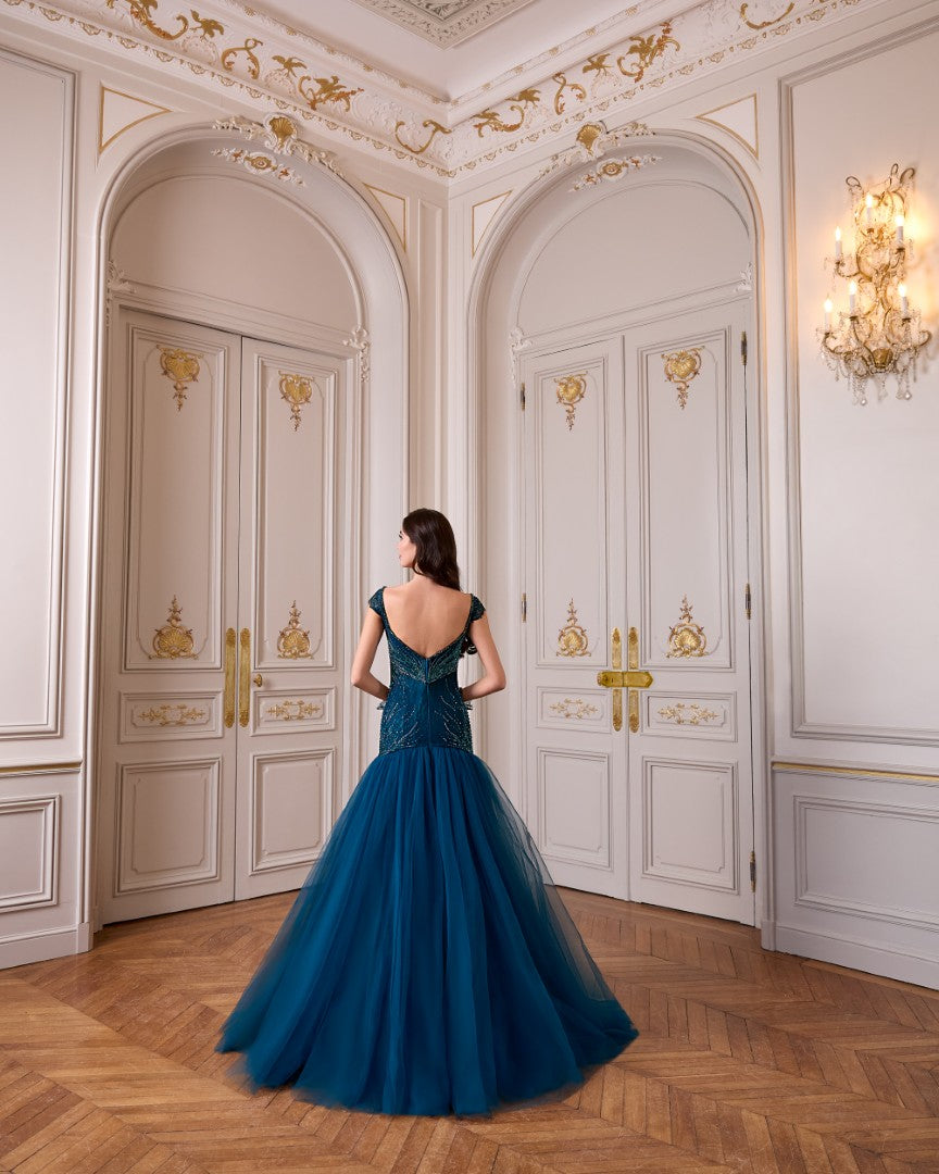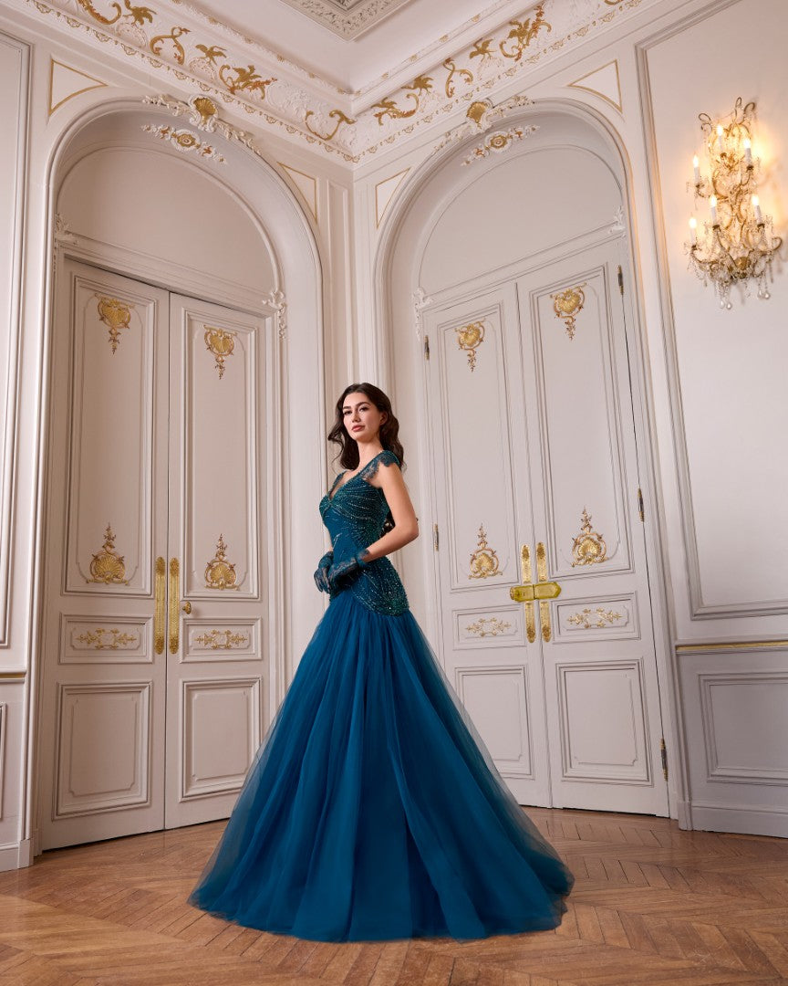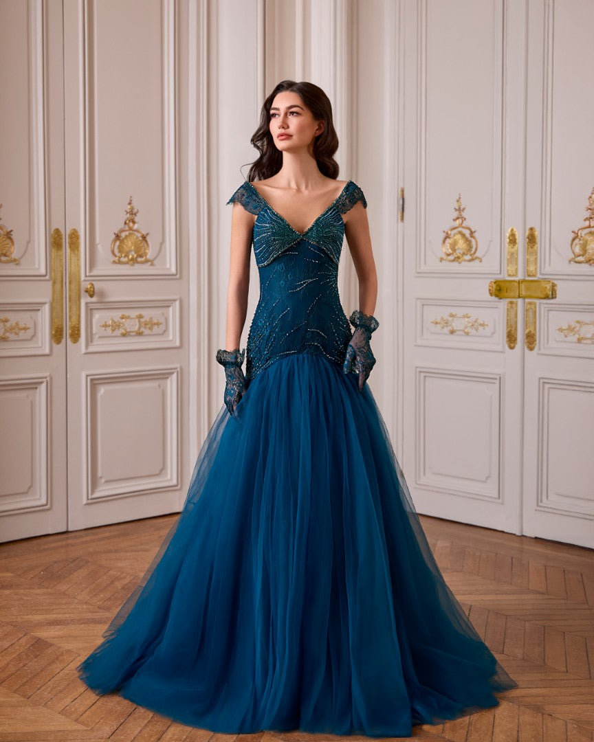 فستان مذهل مزيّن بتطريز دقيق باللون الأخضر المائل للأزرق ومرتب بعناية على جزء علوي من الدانتيل، أما الجزء السفلي فهو مصنوع من التول الانسيابي ليمنحك إطلالة أميرية. كل تفصيلة مصممة لتجعلك تشعرين وكأنك دخلتِ في حكاية خيالية خالدة