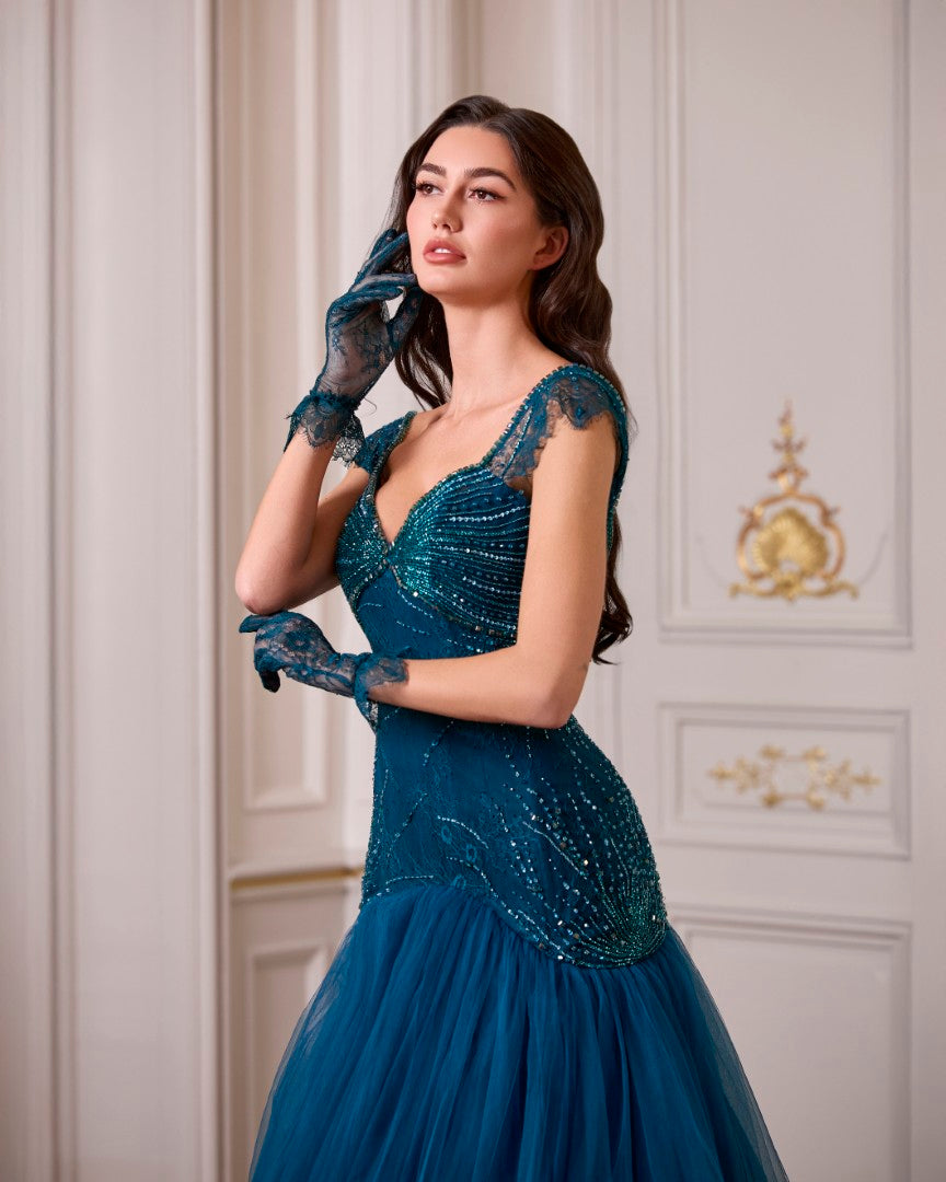 A stunning gown is adorned with intricate teal beadwork carefully arranged on a lace bodice, and the lower part is made with flowing tulle to create a graceful, princess-like silhouette. Each detail is designed to make you feel like you’ve stepped into a timeless fairytale.