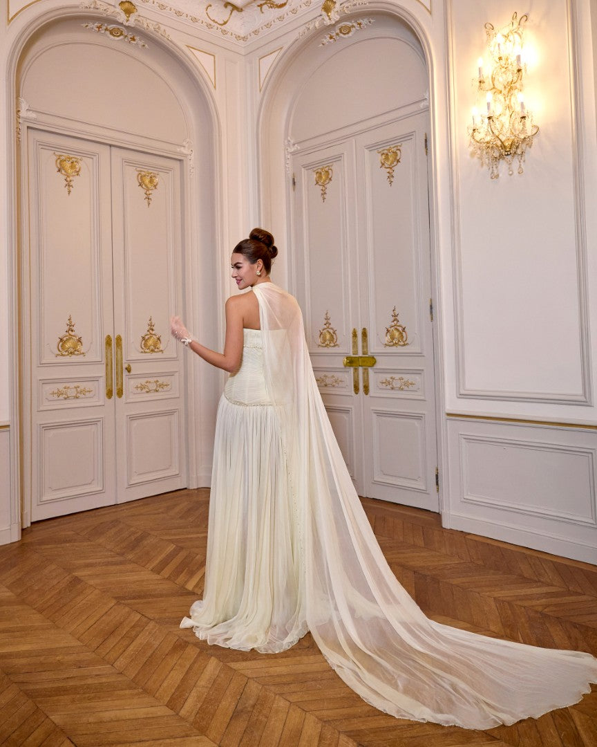 فستان طويل مصنوع بالكامل من الشيفون بلون أصفر فاتح، يتميز بقصّة ناعمة وانسيابية تنساب برقة حتى الأرض، مع ذيل يشبه الكاب يتدلى بخفة على الظهر.