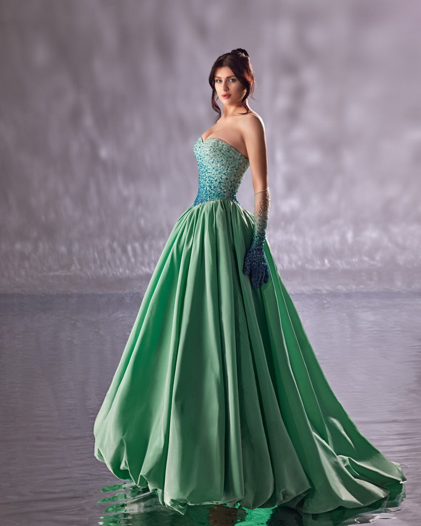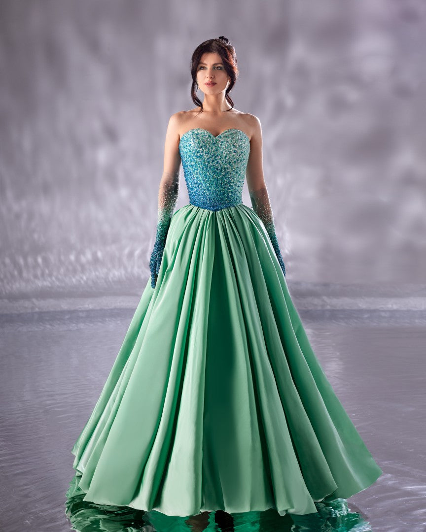 فستان بلون التيفاني جميل و أنثوي يتيمز بتصميم مكشوف الأكتاف. الجزء العلوي مطرز بخرز مستوحى من ألوان المحيط تتلاشى من اللون الفاتح إلى الداكن.