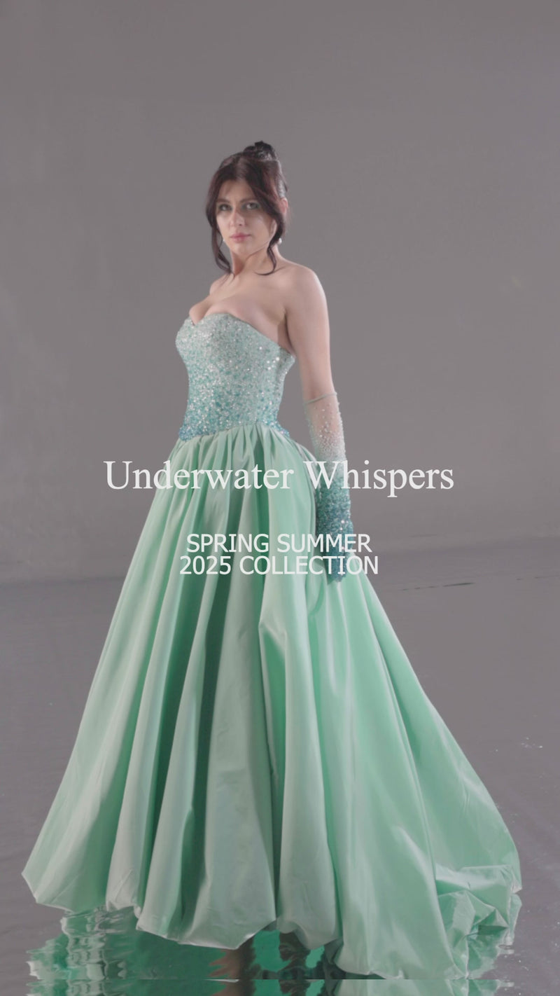 A beautiful, feminine Tiffany dress features an off-shoulder design and a full skirt. The top is embroidered with ocean-colored beads that fade from light to dark.