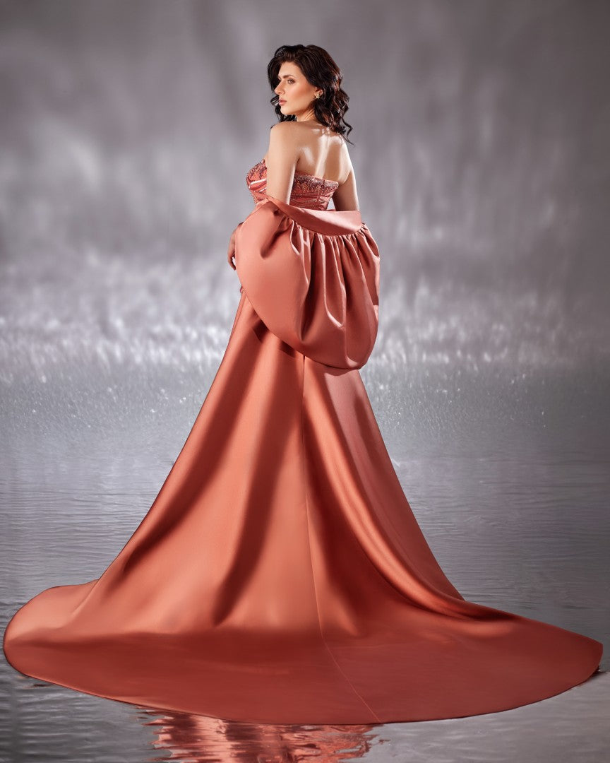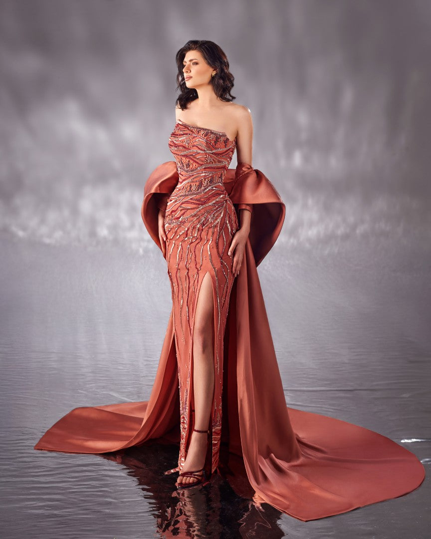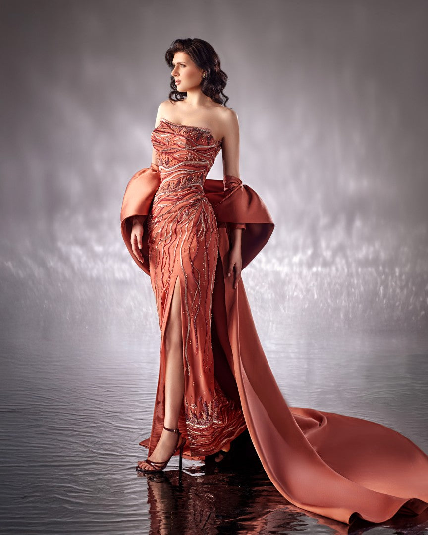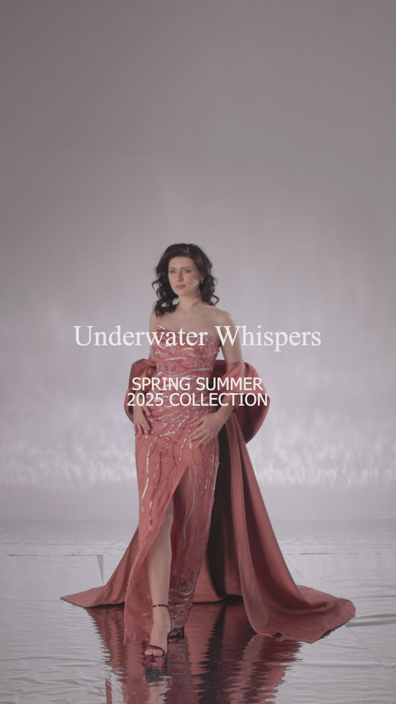 فستان على الجسم باللون الخوخي الآسر، مطرز بشكل أنيق بتصاميم تجسد جمال الحياة تحت الماء، مثل المرجان ونجم البحر. يضفي رداء الميكادو لمسة نهائية أنيقة مثالية.