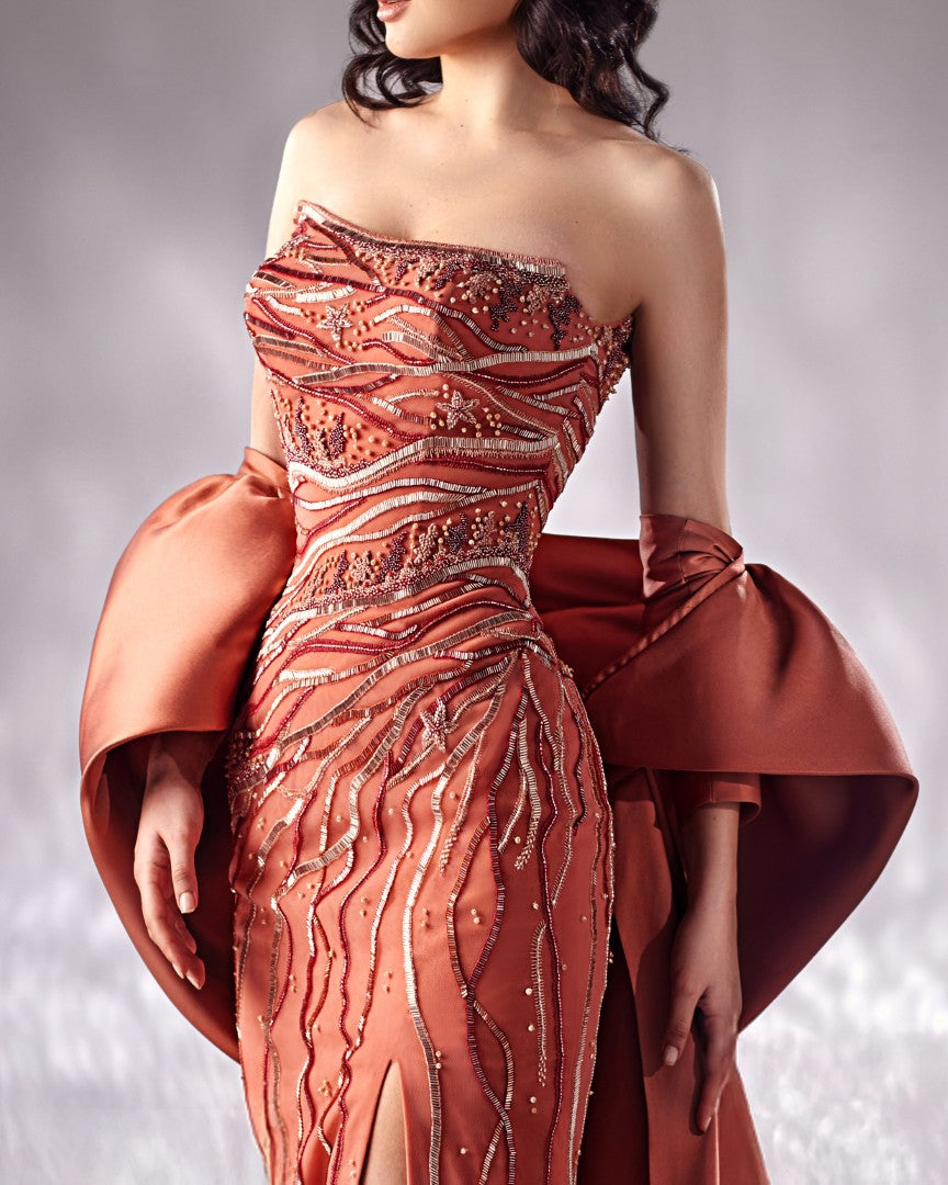 A breathtaking peach skinny dress, intricately embroidered with designs that capture the beauty of underwater life, such as corals and star fish. An oversized mikado cape provides the perfect elegant finish