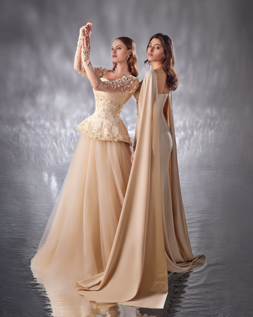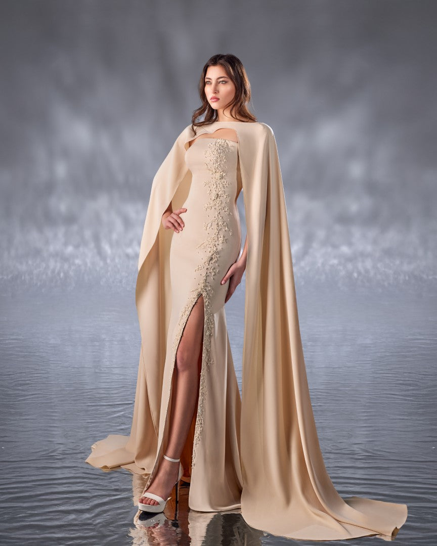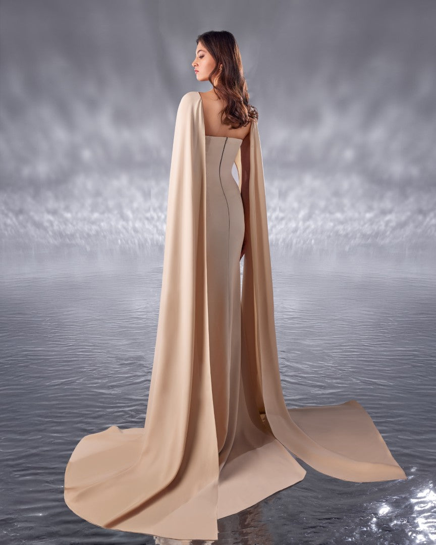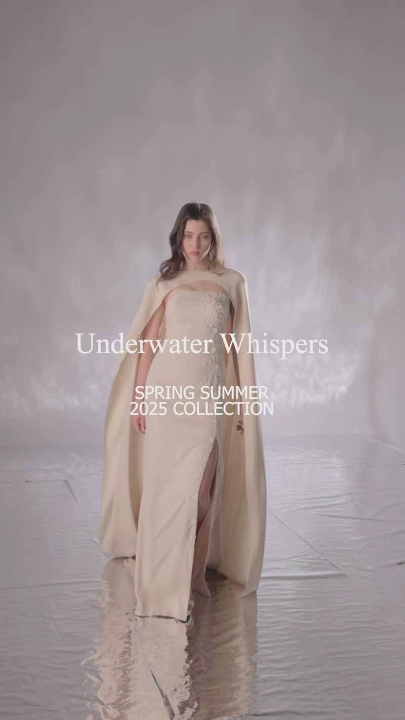 beige crepe dress, cut for a feminine silhouette, features a dramatic cape that flows from the back. The dress is delicately embroidered on one side, with beadwork that mimics the beauty of coral reefs and pearls, adding an elegant and refined touch.