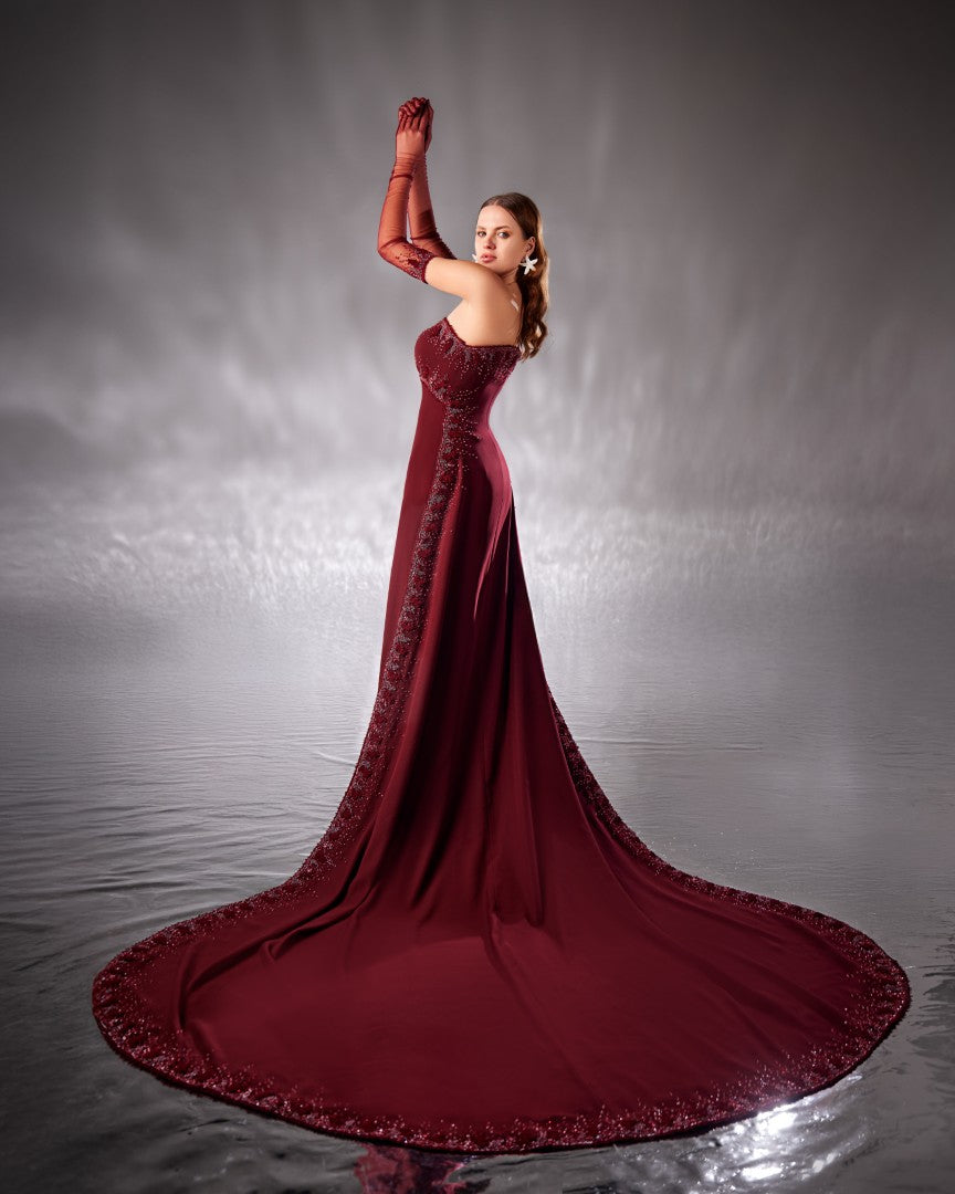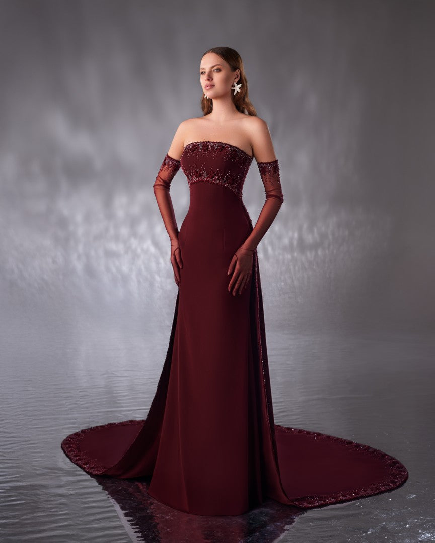 A luxurious burgundy gown , featuring an off-shoulder design and a fitted silhouette. Beaded embellishments are applied along the neckline and sleeves. A dramatic train is extended behind, creating an elegant and graceful effect.