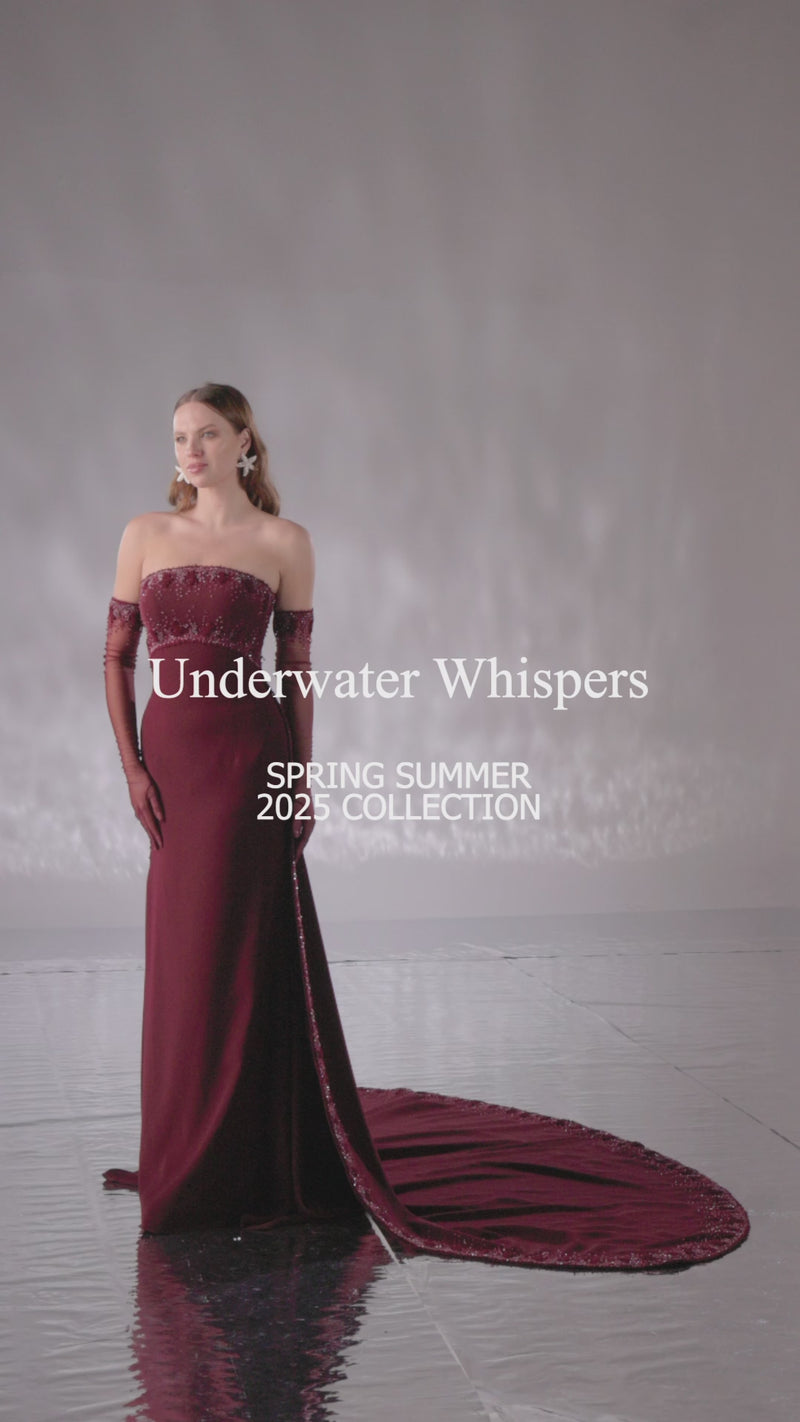 فستان فاخر باللون العنابي بتصميم مكشوف الأكتاف وقصة أنثوية. زين الفستان بتطريزات وخرز مستوحى من الشعاب المرجانية و اللؤلؤ على شكل خط على الفستان والأكمام . يتميز الفستان بذيل طويل من الخلف ليضفي لمسة من الأناقة والرقي .