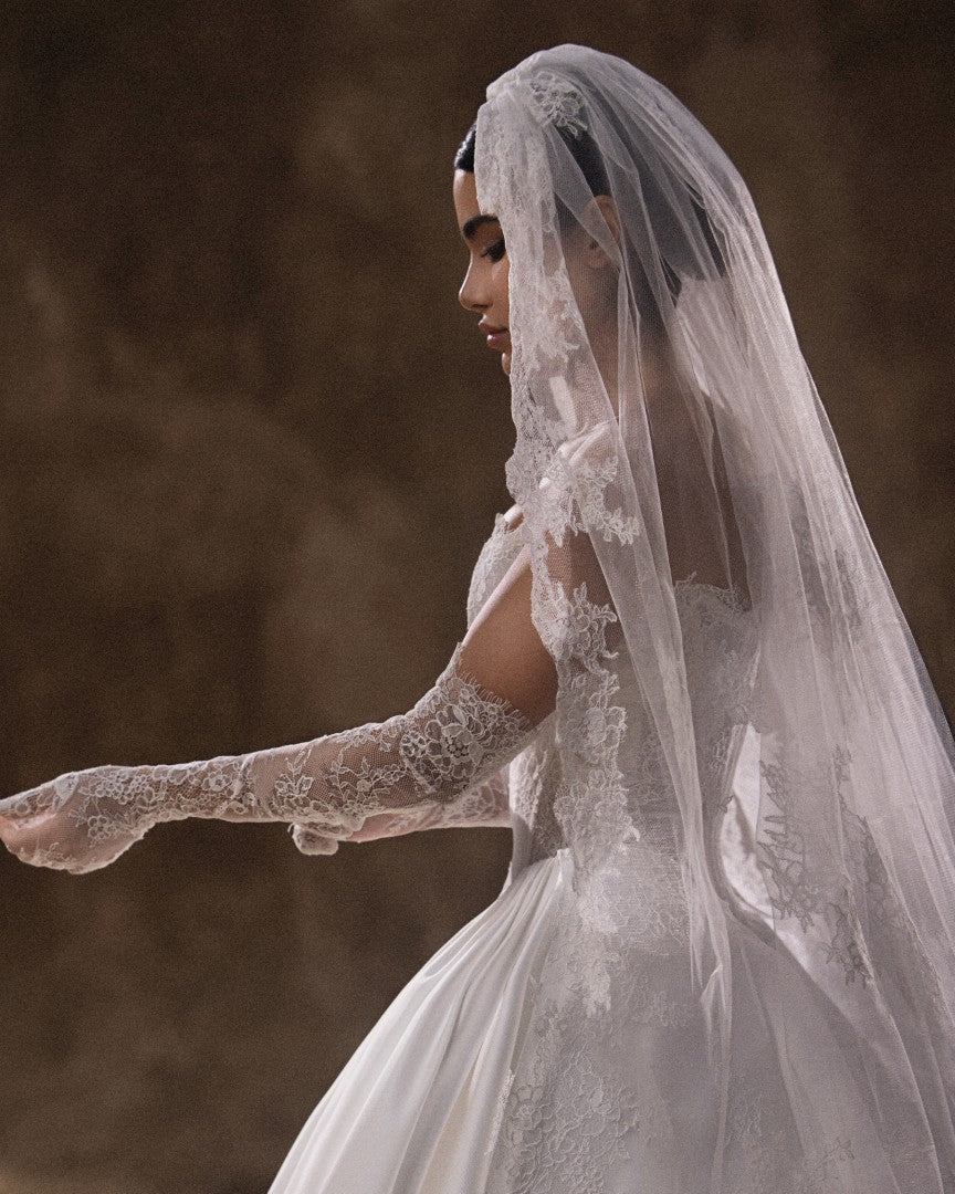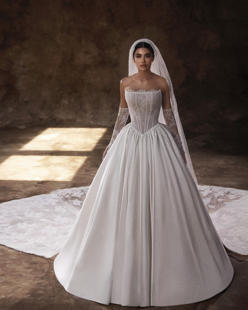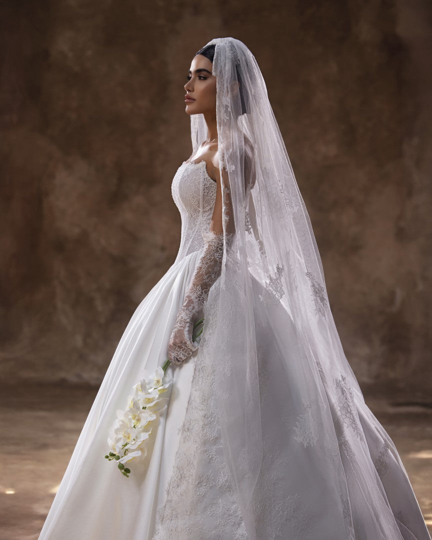 فستان أنيق بتصميم كورسيه من الدانتيل، وقفازات دانتيل رقيقة، وتنورة منسدلة واسعة تنساب برقي لتمنح إطلالة ملكية ساحرة.