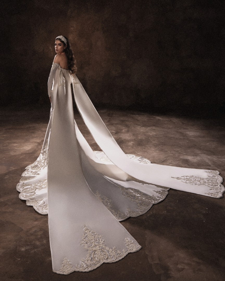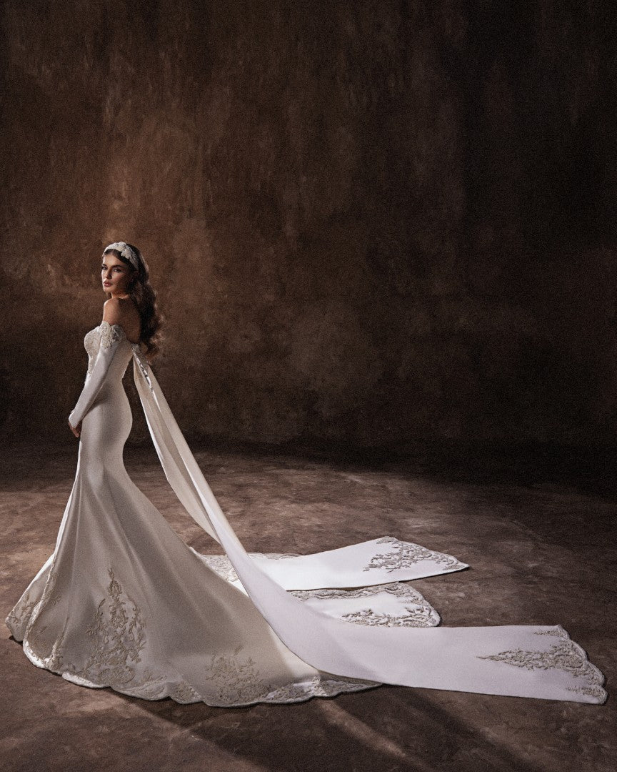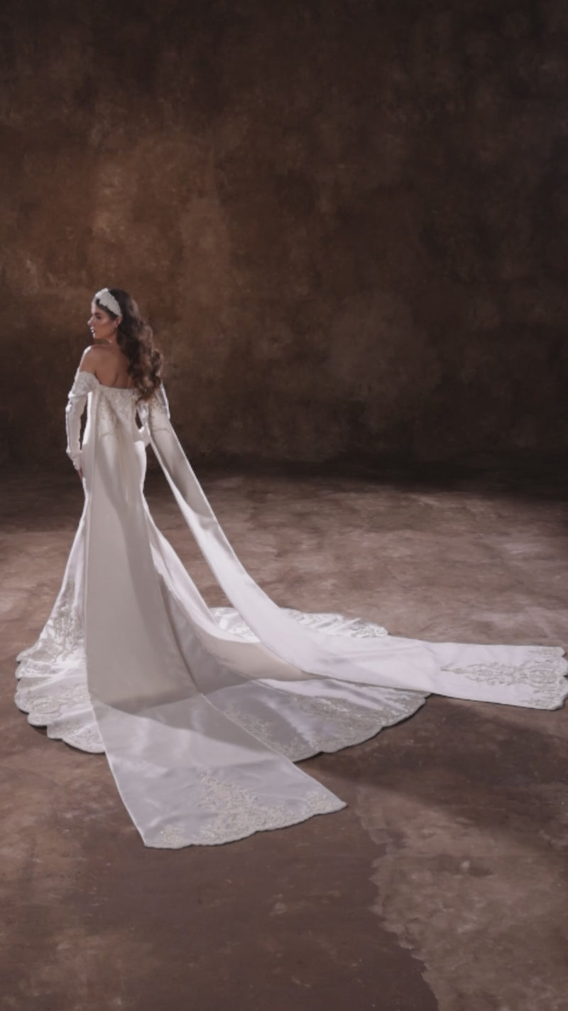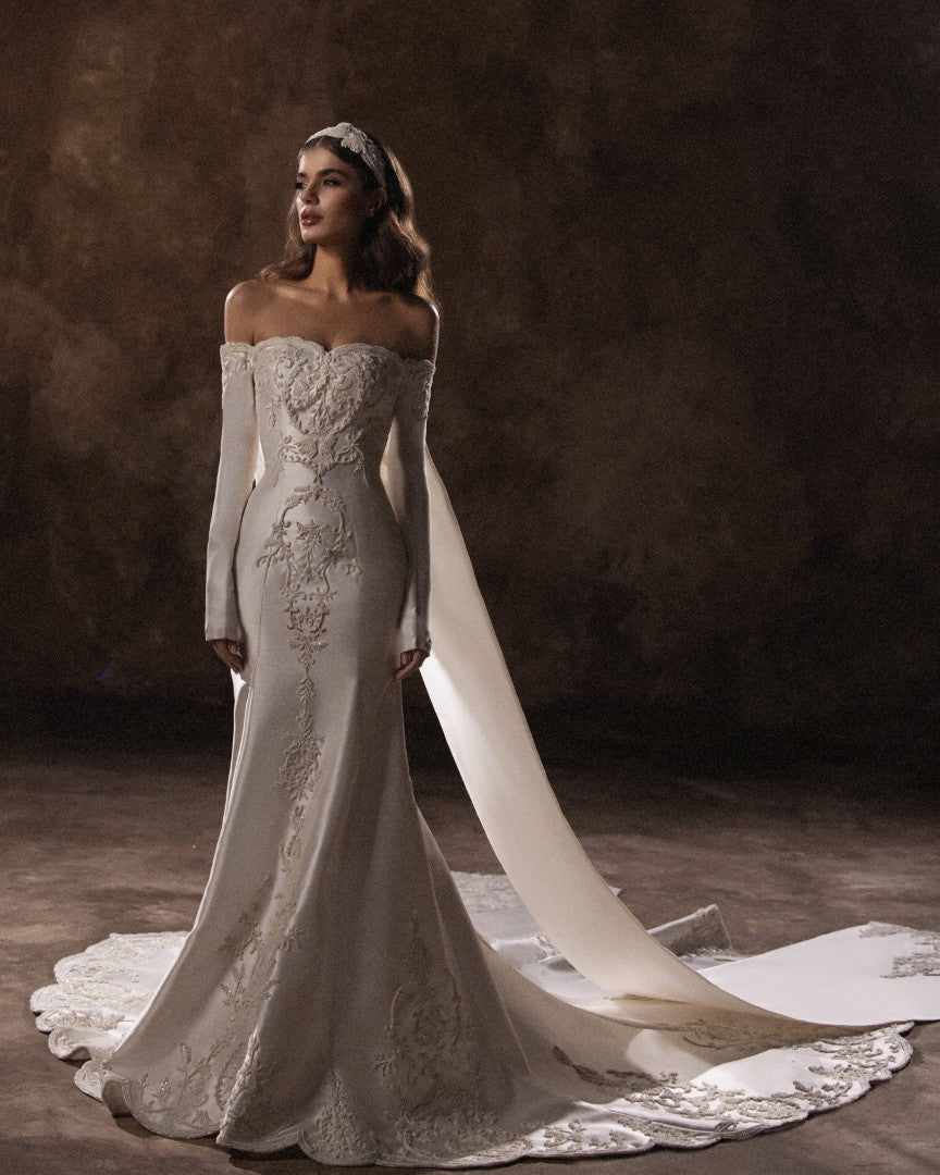 فستان ملكي يجمع بين التقليد والأناقة العصرية. بتصميم كتف مكشوف، وتطريزات فاخرة، وذيل منسدل، كل تفصيل يحكي قصة حب ورقي وفخامة