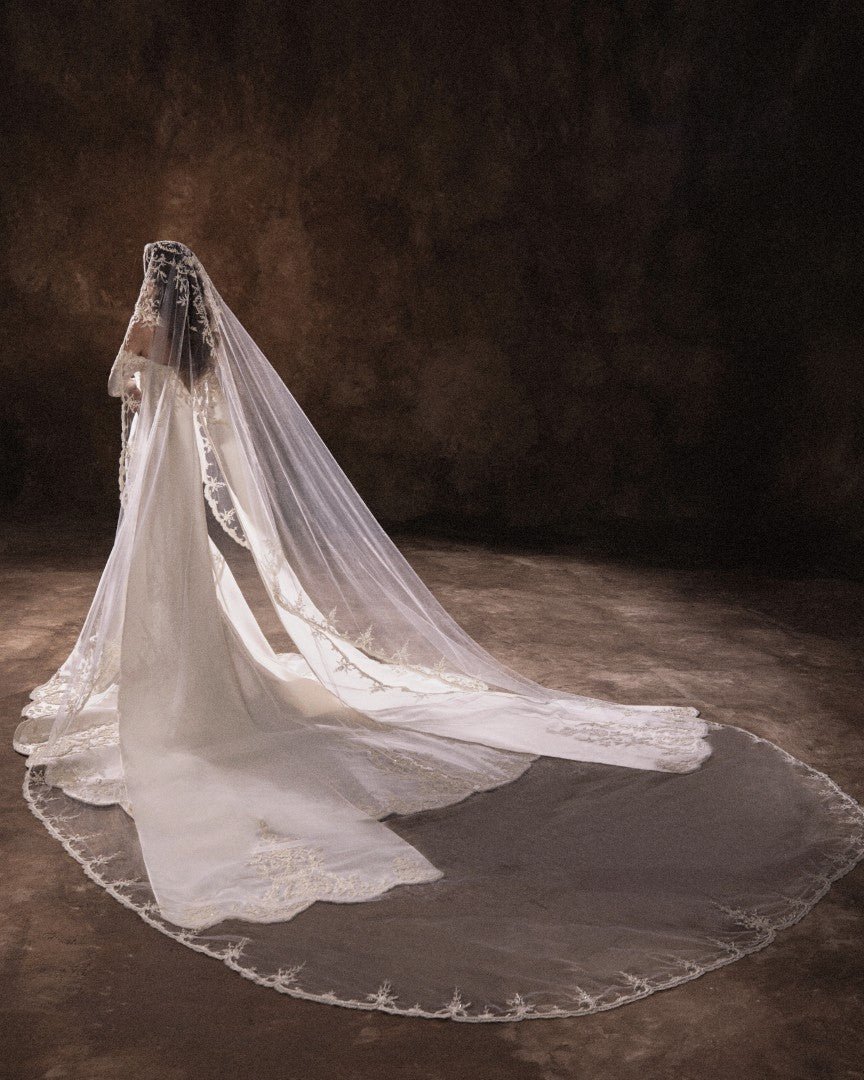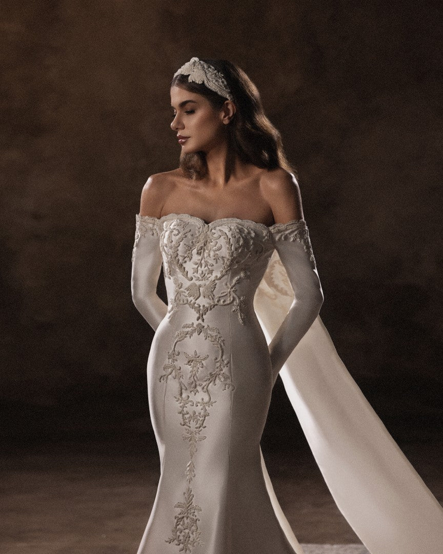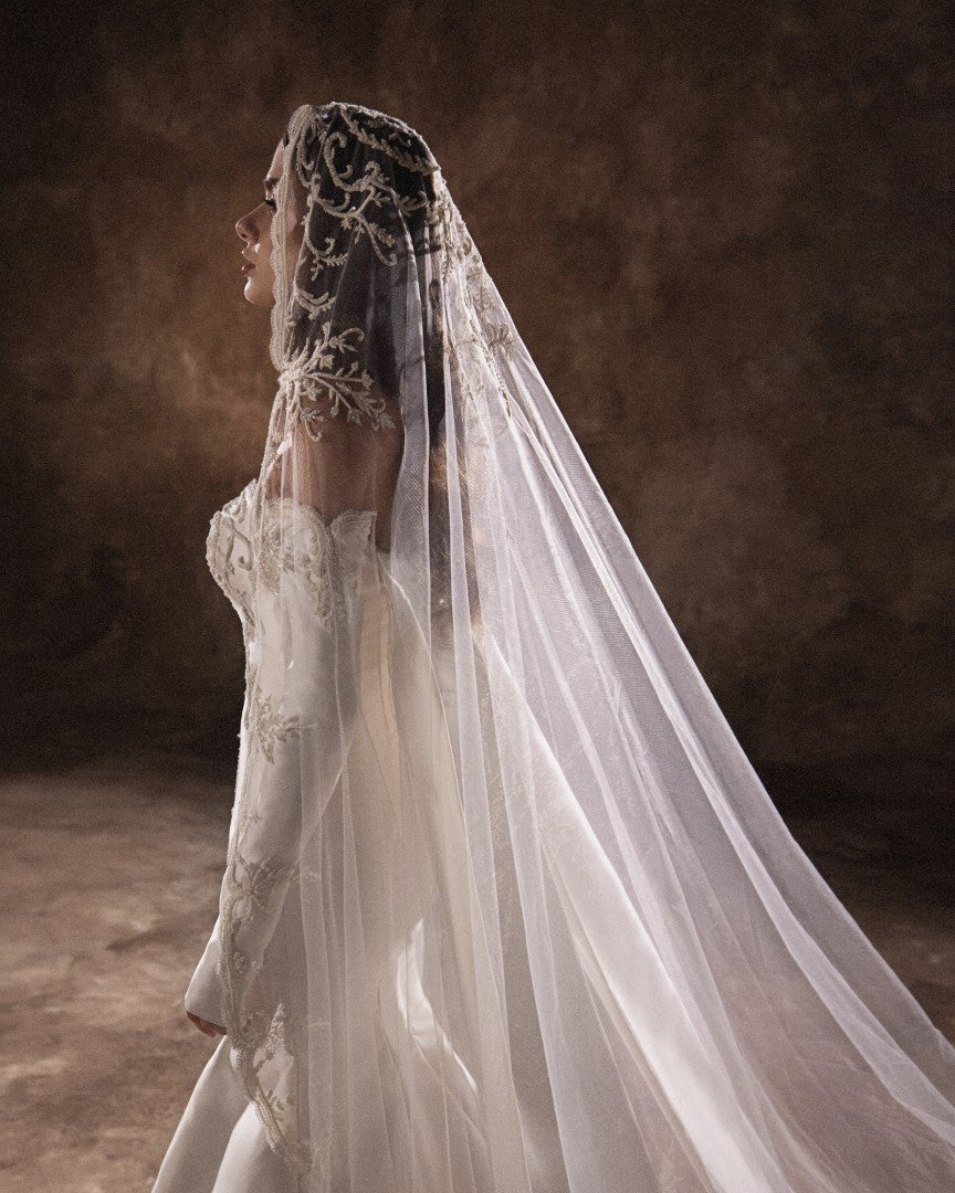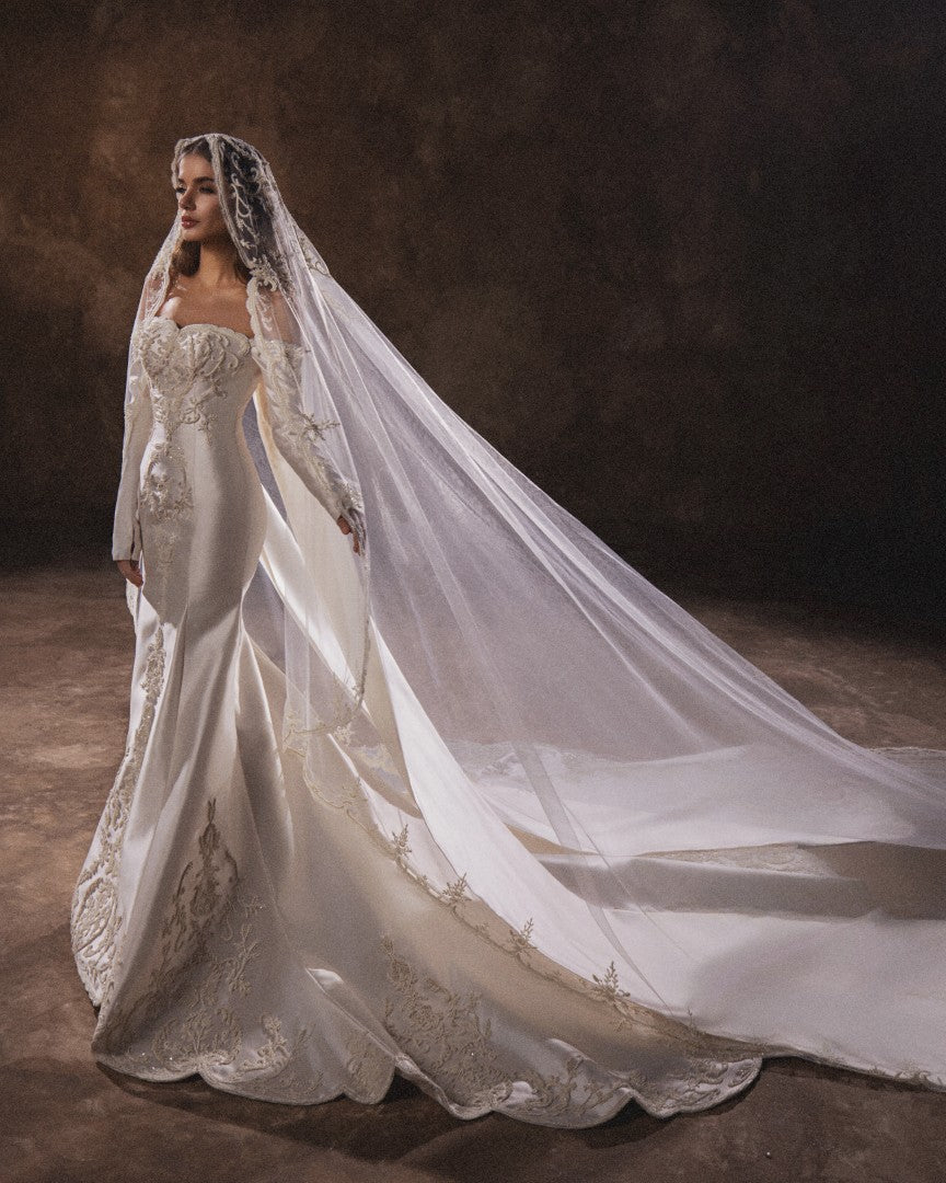فستان ملكي يجمع بين التقليد والأناقة العصرية. بتصميم كتف مكشوف، وتطريزات فاخرة، وذيل منسدل، كل تفصيل يحكي قصة حب ورقي وفخامة